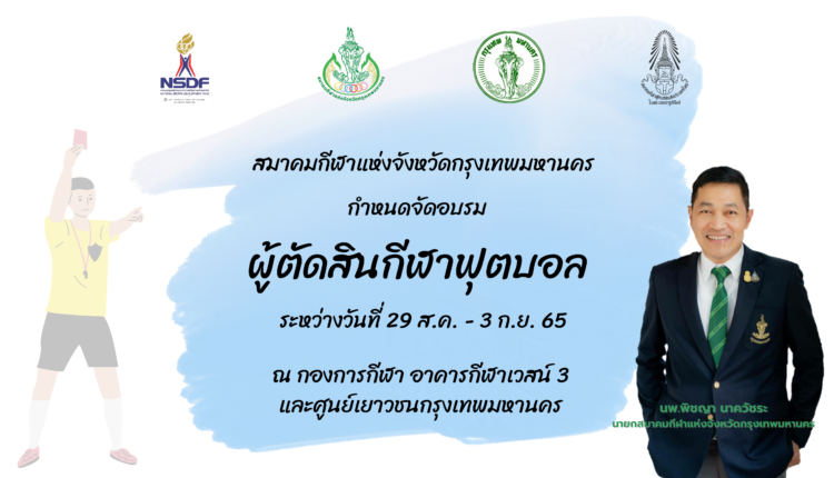 นายแพทย์พิชญา  นาควัชระ  นายกสมาคมกีฬาแห่งจังหวัดกรุงเทพมหานคร เปิดเผยภายหลังการประชุมคณะกรรมการบริหารสมาคมกีฬาแห่งจังหวัดกรุงเทพมหานคร ครั้งที่ 7/2565 ว่า  สมาคมคมกีฬาแห่งจังหวัดกรุงเทพมหานคร ร่วมกับกองทุนพัฒนาการกีฬาแห่งชาติ สมาคมกีฬาฟุตบอลแห่งประเทศไทย ในพระบรมราชูปถัมภ์  กำหนดจัดโครงการพัฒนาบุคลากรของสมาคมกีฬาแห่งจังหวัดกรุงเทพมหานครประจำปีงบประมาณ พ.ศ. 2565 หลักสูตรการอบรมผู้ตัดสินกีฬาฟุตบอล ระหว่างวันที่ 29 สิงหาคม ถึง 3 กันยายน 2565 ณ กองการกีฬา อาคารกีฬาเวสน์ 3 และศูนย์เยาวชนกรุงเทพมหานคร โดยมีวิทยากรจากสมาคมกีฬาฟุตบอลแห่งประเทศไทย ในพระบรมราชูปถัมภ์ เป็นผู้บรรยาย และฝึกอบรมให้ความรู้ และผู้ที่ผ่านการฝึกอบรมจะได้รับใบประกาศนียบัตร