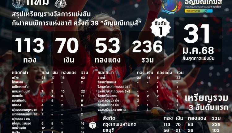 สิ้นสุดการแข่งขันกีฬาคนพิการแห่งชาติ ครั้งที่ 39 “อัญมณีเกมส์” โดยมีจังหวัดจันทบุรีเป็นเจ้าภาพจัดการแข่งขันระหว่างวันที่ 25 – 31 มกราคม 2568