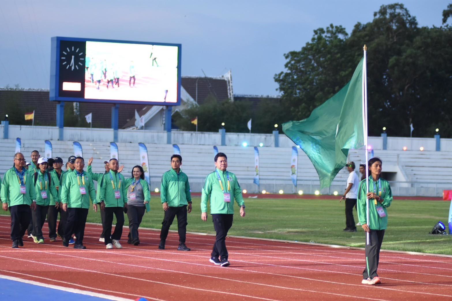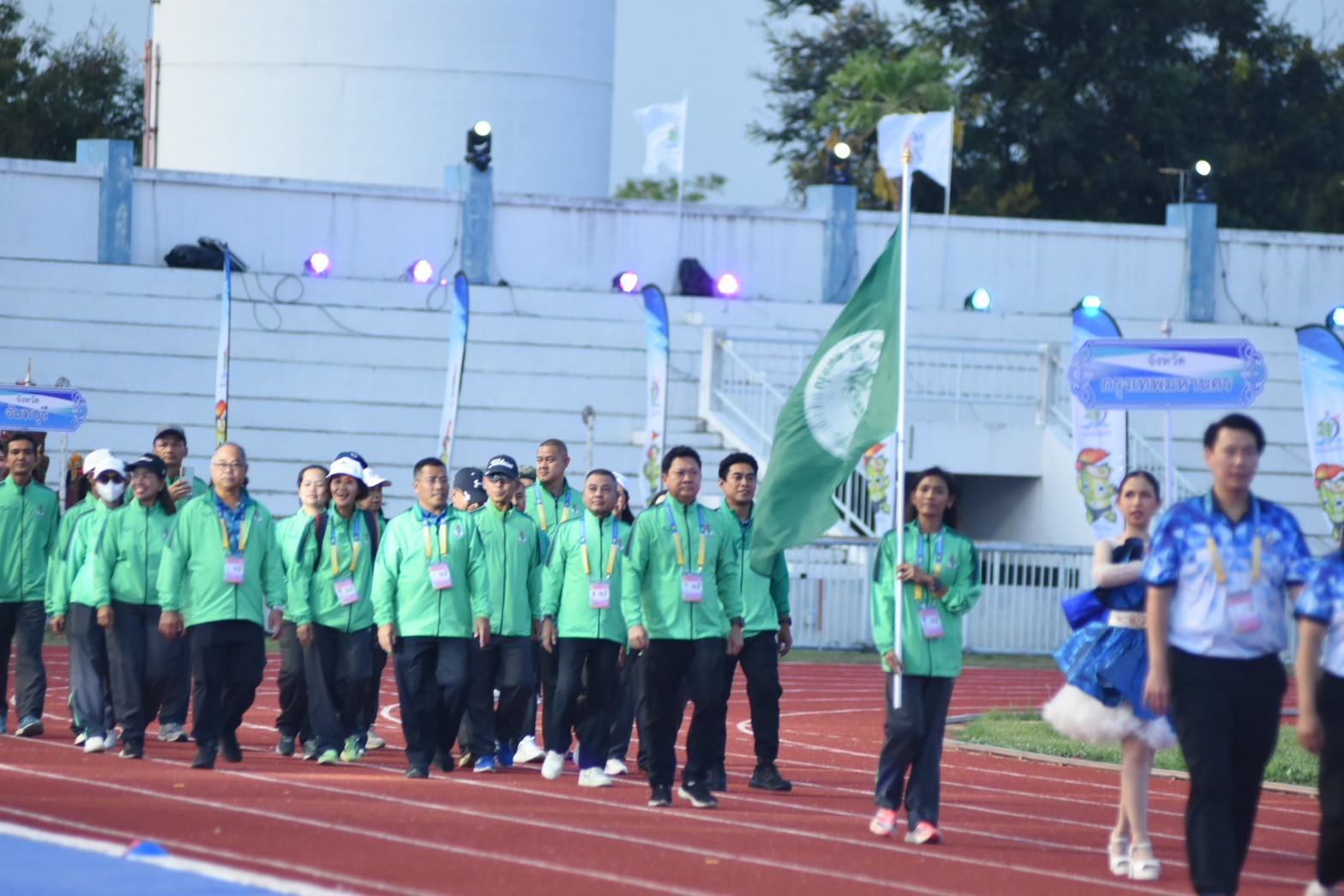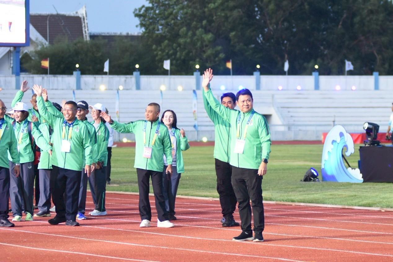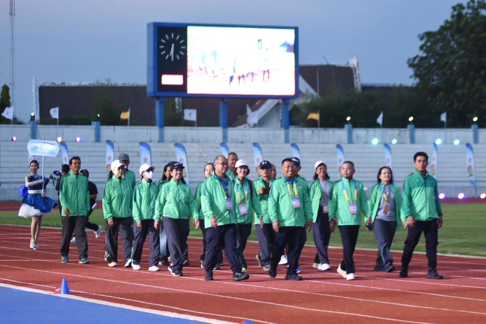 พร้อมด้วย ผอ.สวท.นายสิงห์ ลิ้มพิรัตน์ ในฐานะหัวหน้าคณะนักกีฬาเดินนำขบวนพาเหรดคณะเจ้าหน้าที่และนักกีฬากรุงเทพมหานคร ในพิธีเปิดการแข่งขันกีฬาอาวุโสแห่งชาติ ครั้งที่ 7 ระดับชาติ “ข้าวหลามเกมส์”