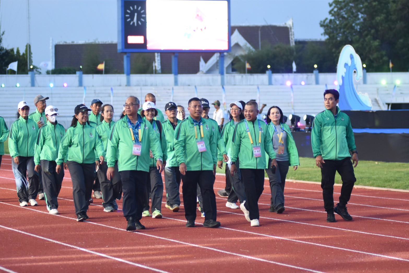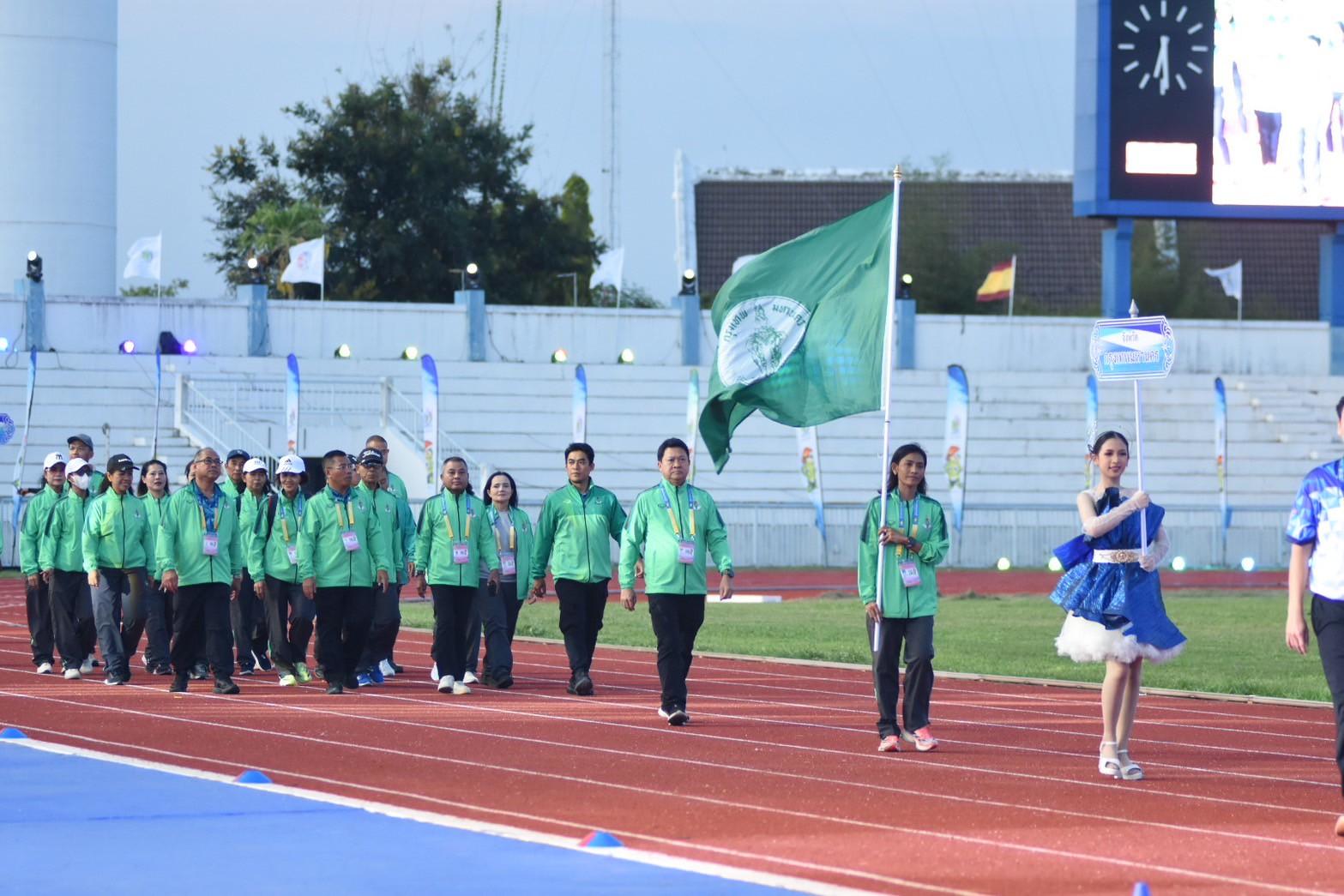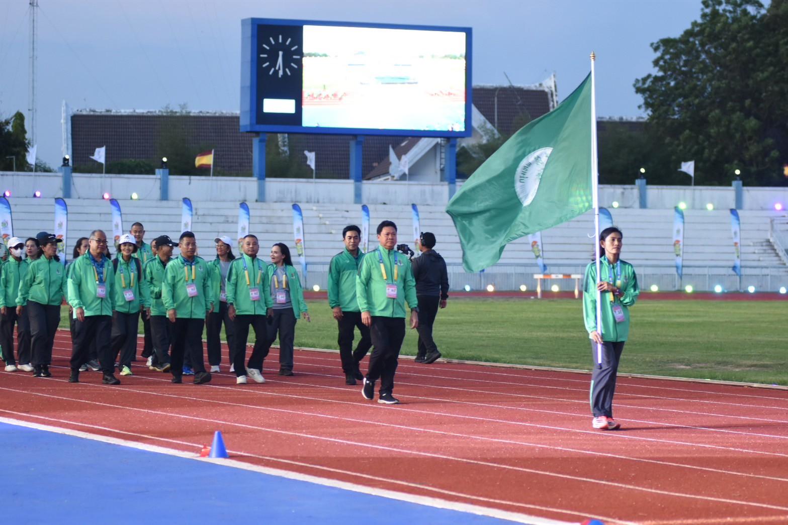 พร้อมด้วย ผอ.สวท.นายสิงห์ ลิ้มพิรัตน์ ในฐานะหัวหน้าคณะนักกีฬาเดินนำขบวนพาเหรดคณะเจ้าหน้าที่และนักกีฬากรุงเทพมหานคร ในพิธีเปิดการแข่งขันกีฬาอาวุโสแห่งชาติ ครั้งที่ 7 ระดับชาติ “ข้าวหลามเกมส์”