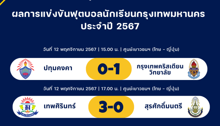 12 พ.ย.67-การแข่งขันฟุตบอลนักเรียนกรุงเทพมหานคร ประจำปี 2567 “Governor Cup 2024” วัน อังคาร ที่ 12 พ.ย. 67 ที่ ศูนย์เยาวชนกรุงเทพมหานคร ไทย- ญี่ปุ่น เป็นการแข่งขันนัดแรก ของสาย บี มีผลการแข่งขันดังนี้