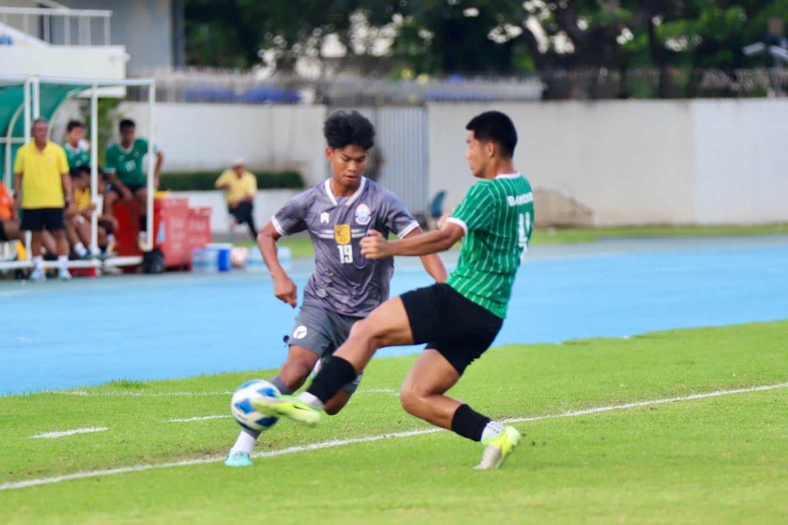 เริ่มเกมต่างฝ่ายต่างผลัดกับรุกและรับ ก่อนจะเป็น รร.กีฬา กทม ที่มาได้ประตูขึ้นนำก่อน 1-0 จาก คงณัต ท้วมทองดี น.35 ก่อนจะจบครึ่งแรกด้วยสกอร์ดังกล่าว