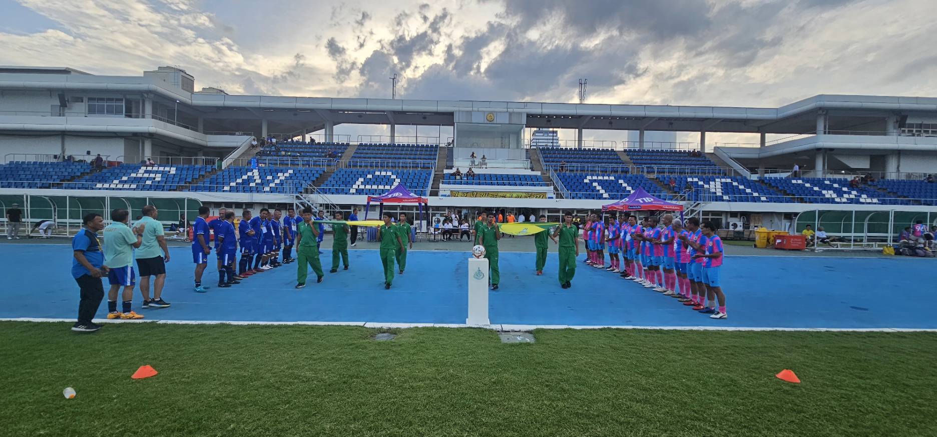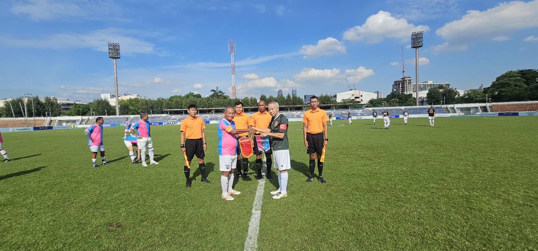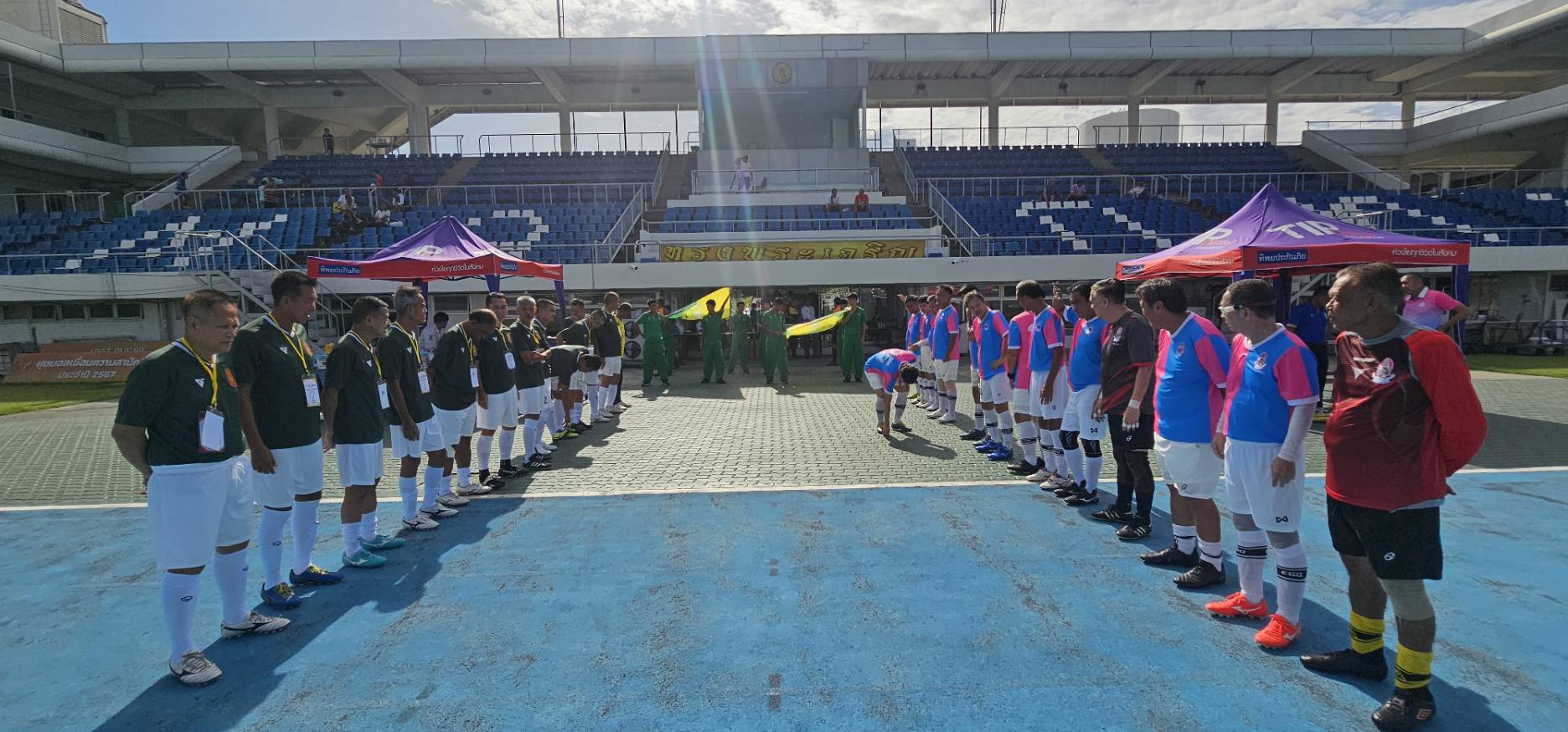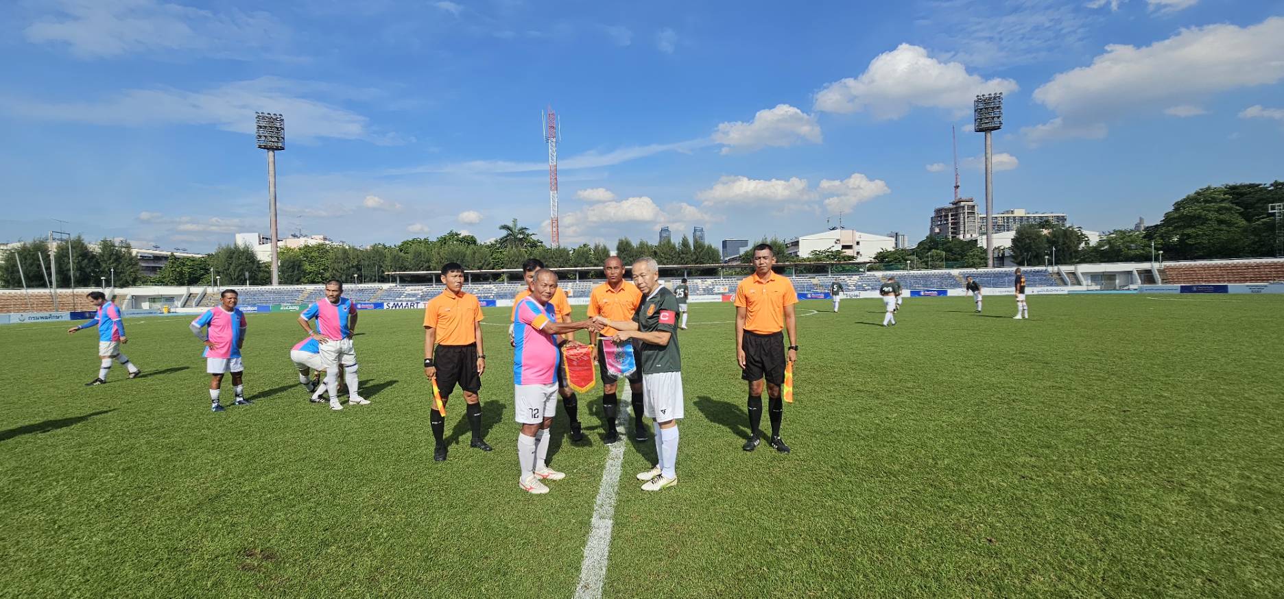 ทีมทหารบก ในชุดสีเขียว พบกับ ทีมสมาคมศิษย์เก่าสวนกุหลาบ ในชุดสีชมพู-ฟ้า