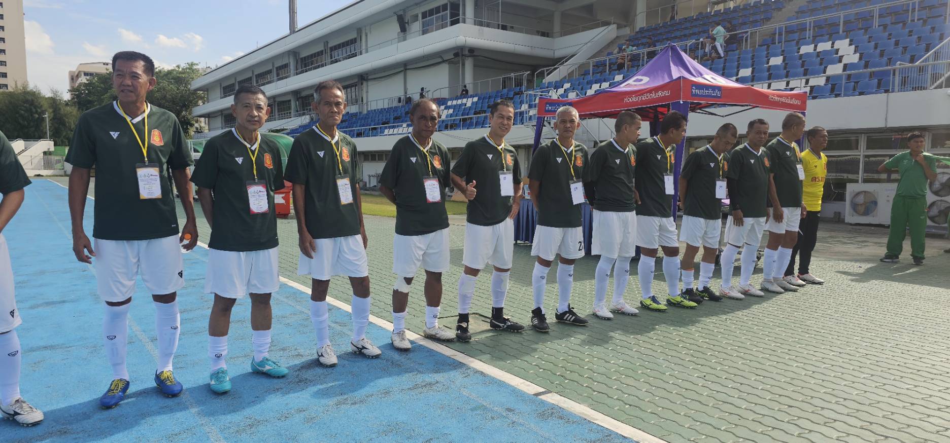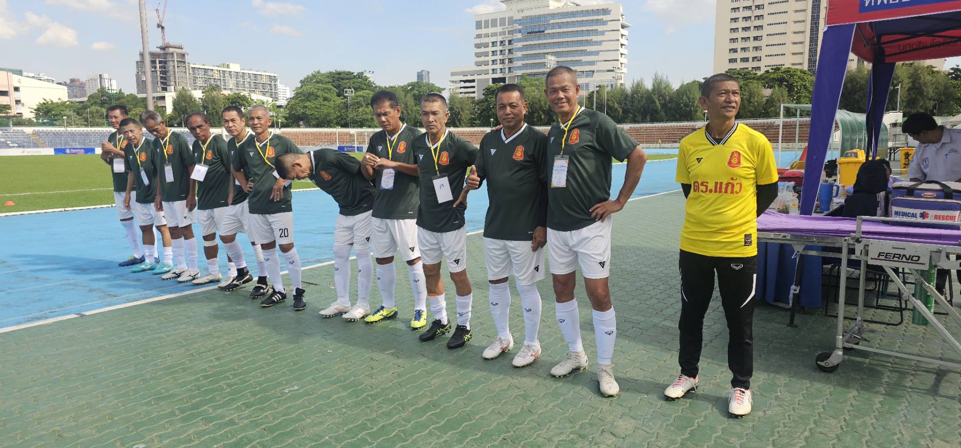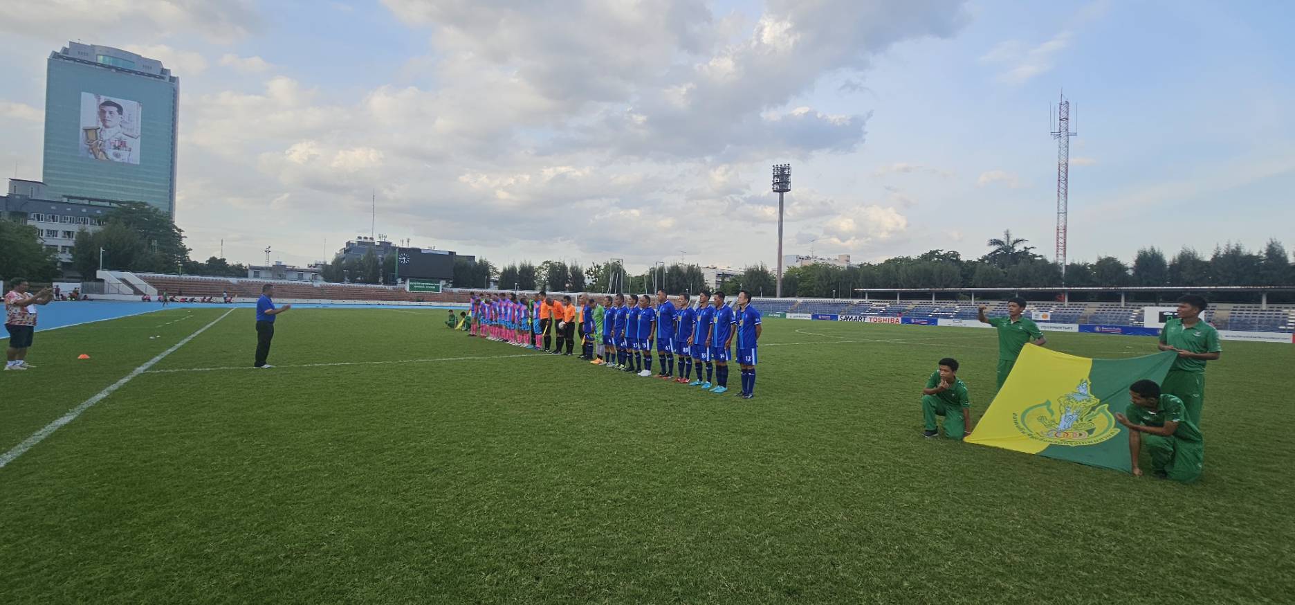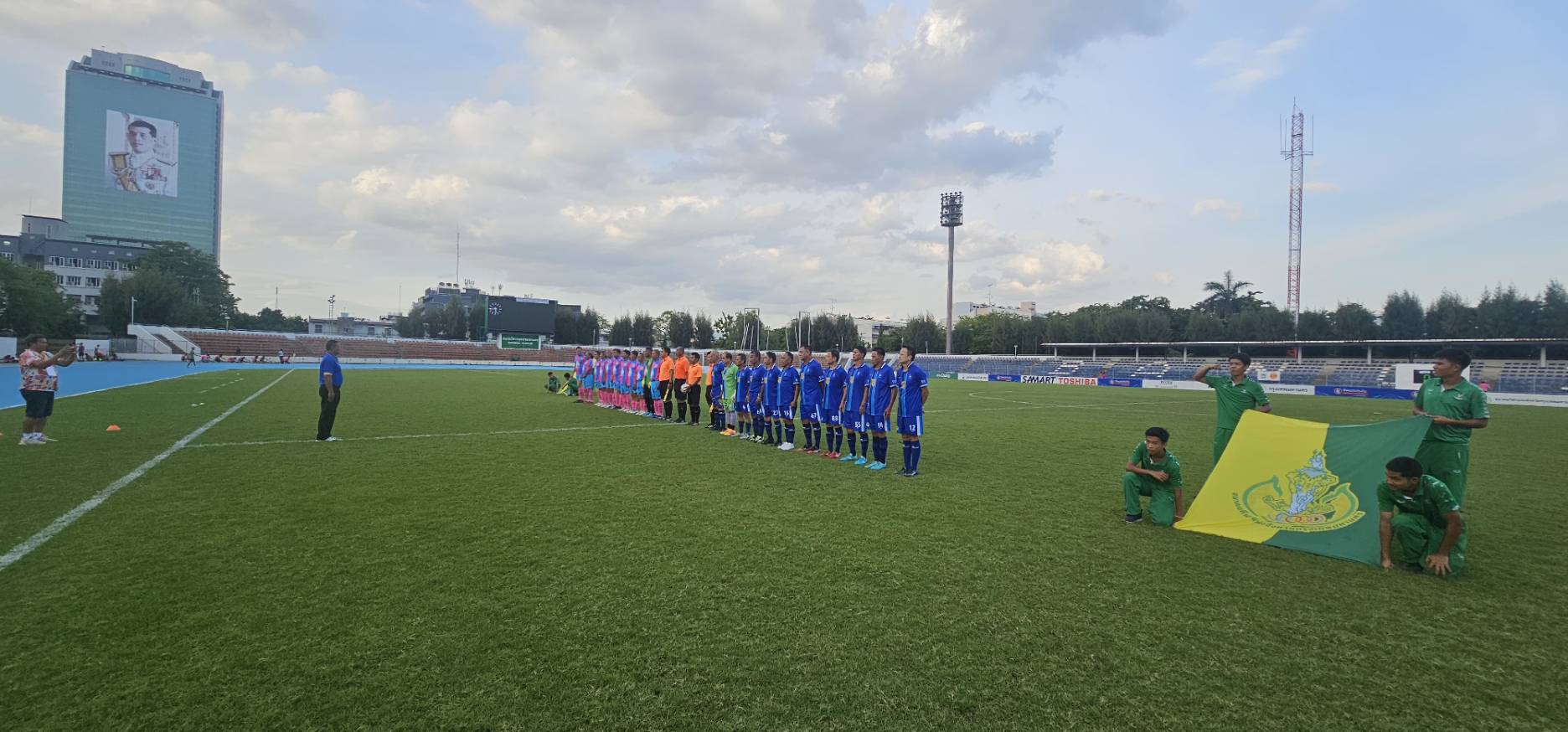 ทีมทหารบก ในชุดสีเขียว พบกับ ทีมสมาคมศิษย์เก่าสวนกุหลาบ ในชุดสีชมพู-ฟ้า