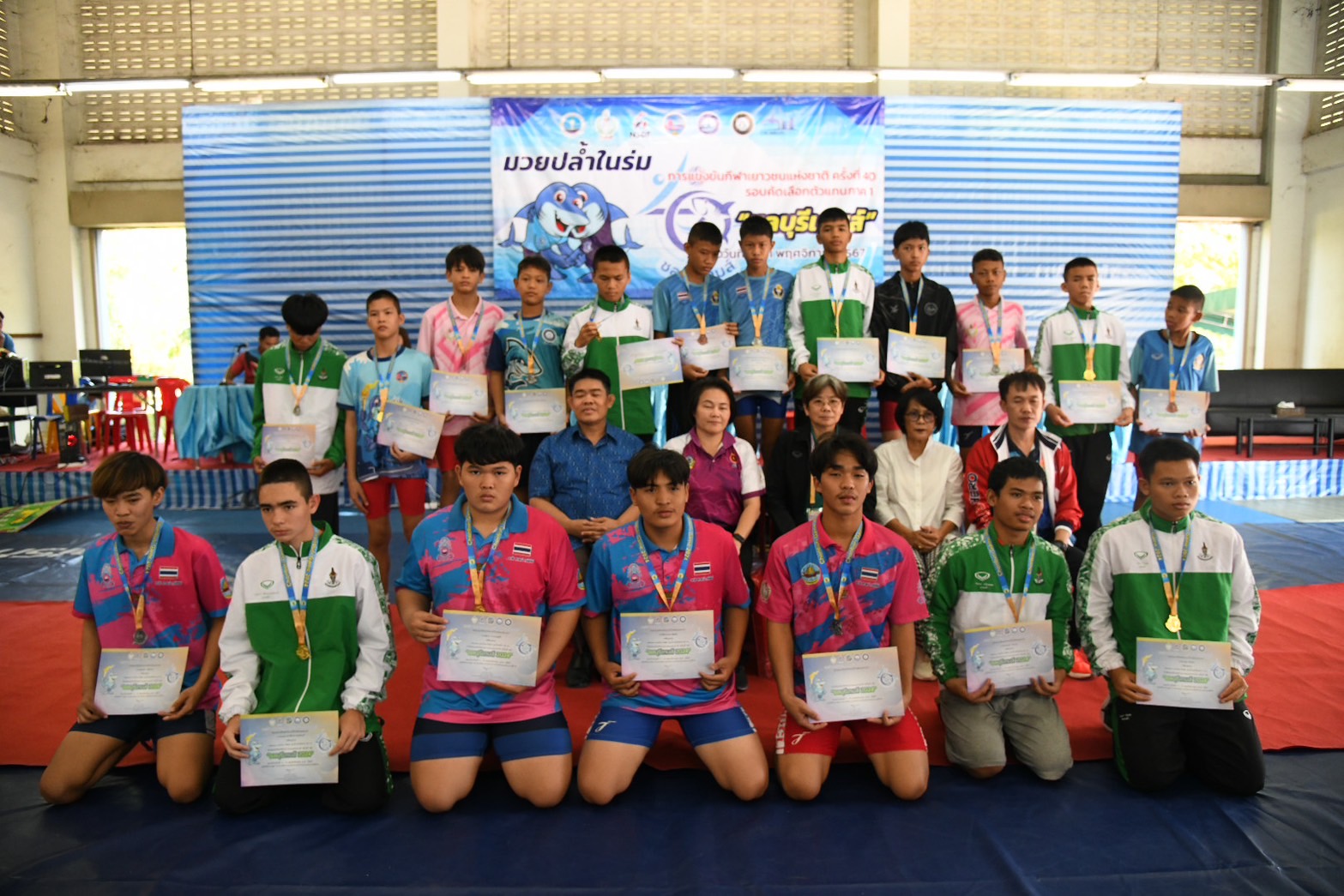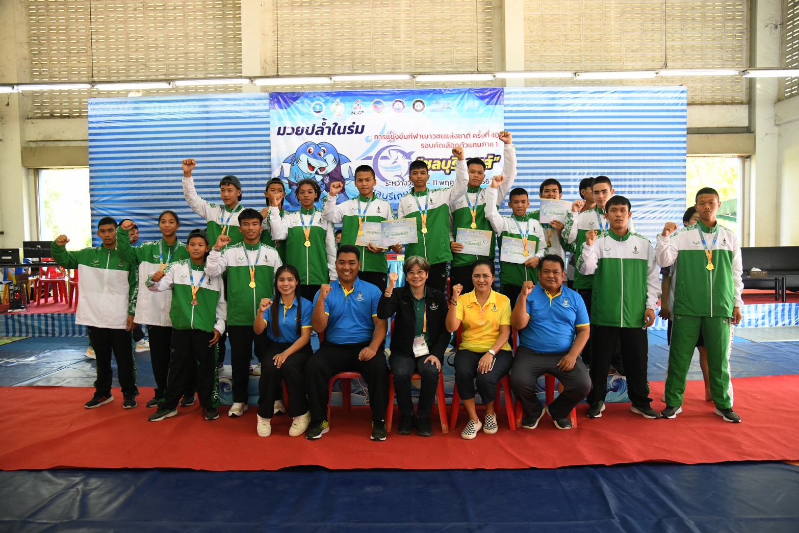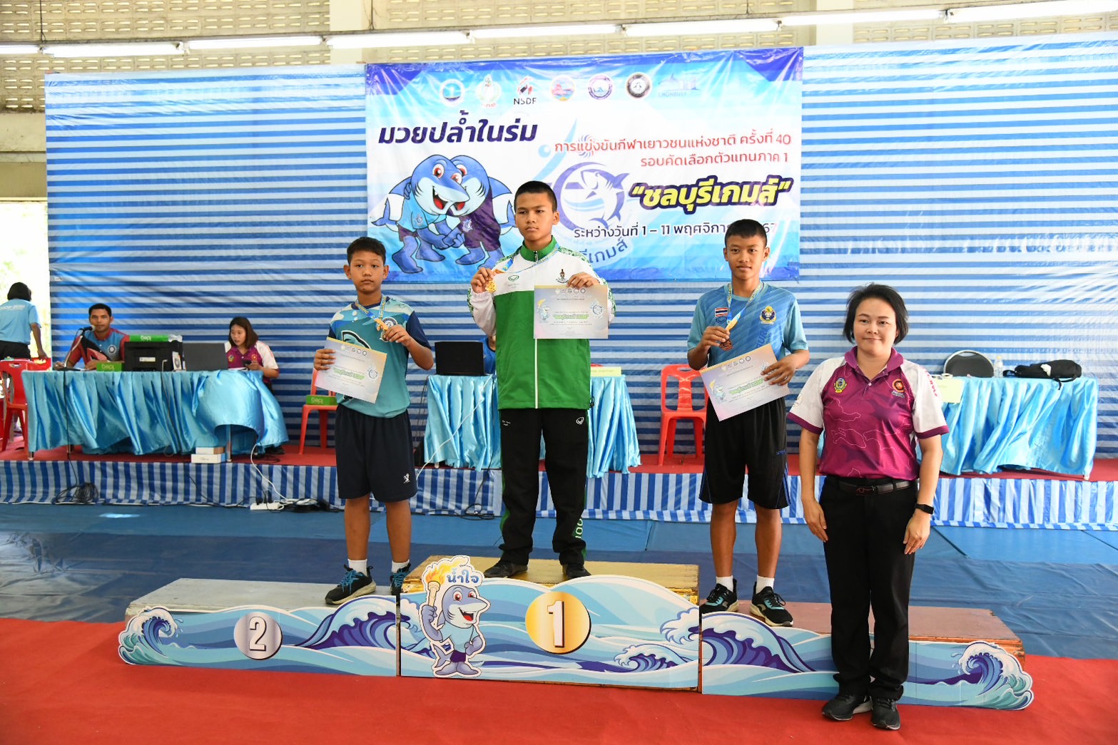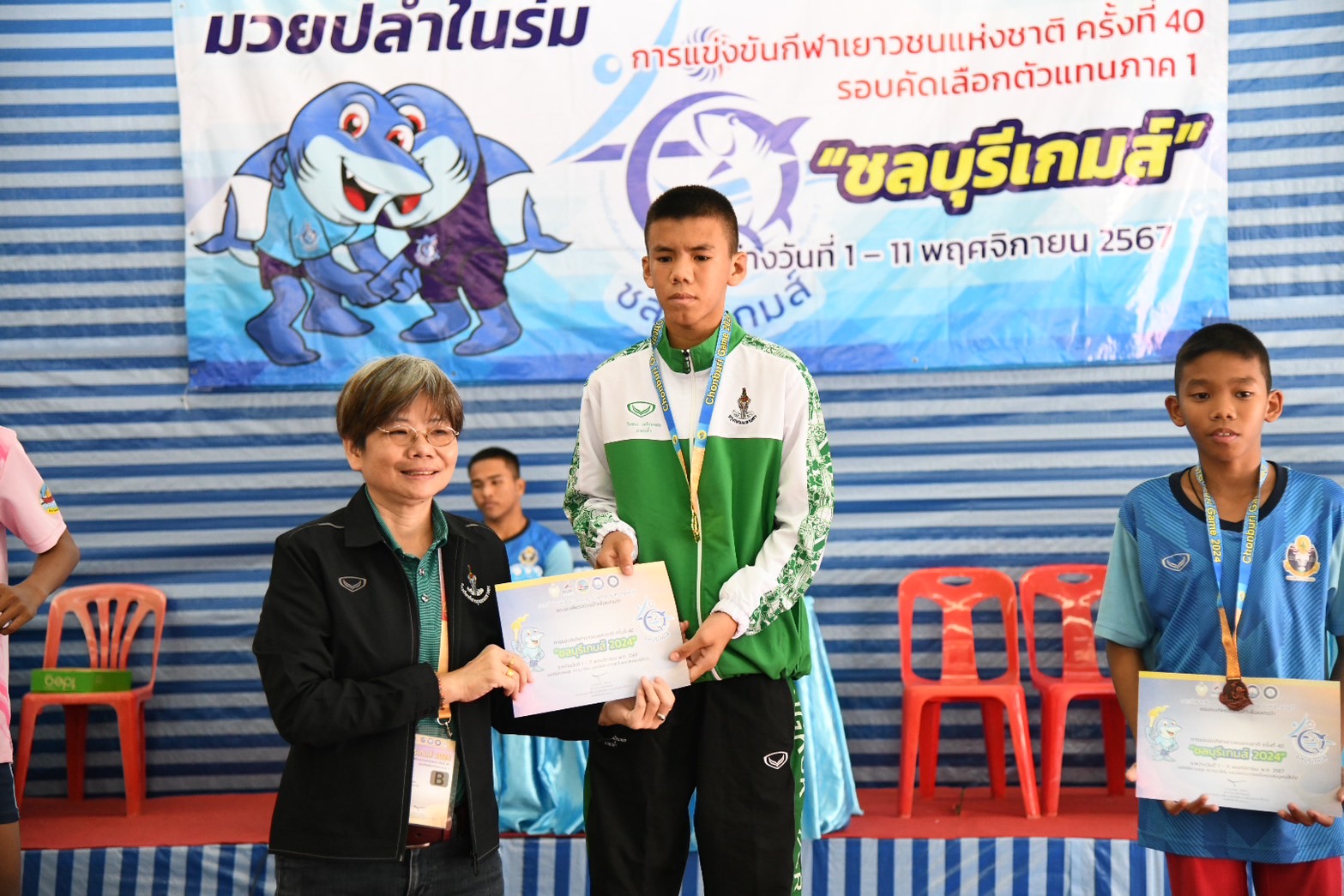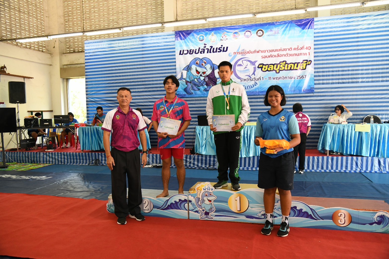 พร้อมนี้ได้ให้เกียรติมอบเหรียญรางวัลให้แก่นักกีฬามวยปล้ำในร่ม ณ โรงเรียนกีฬาจังหวัดชลบุรี