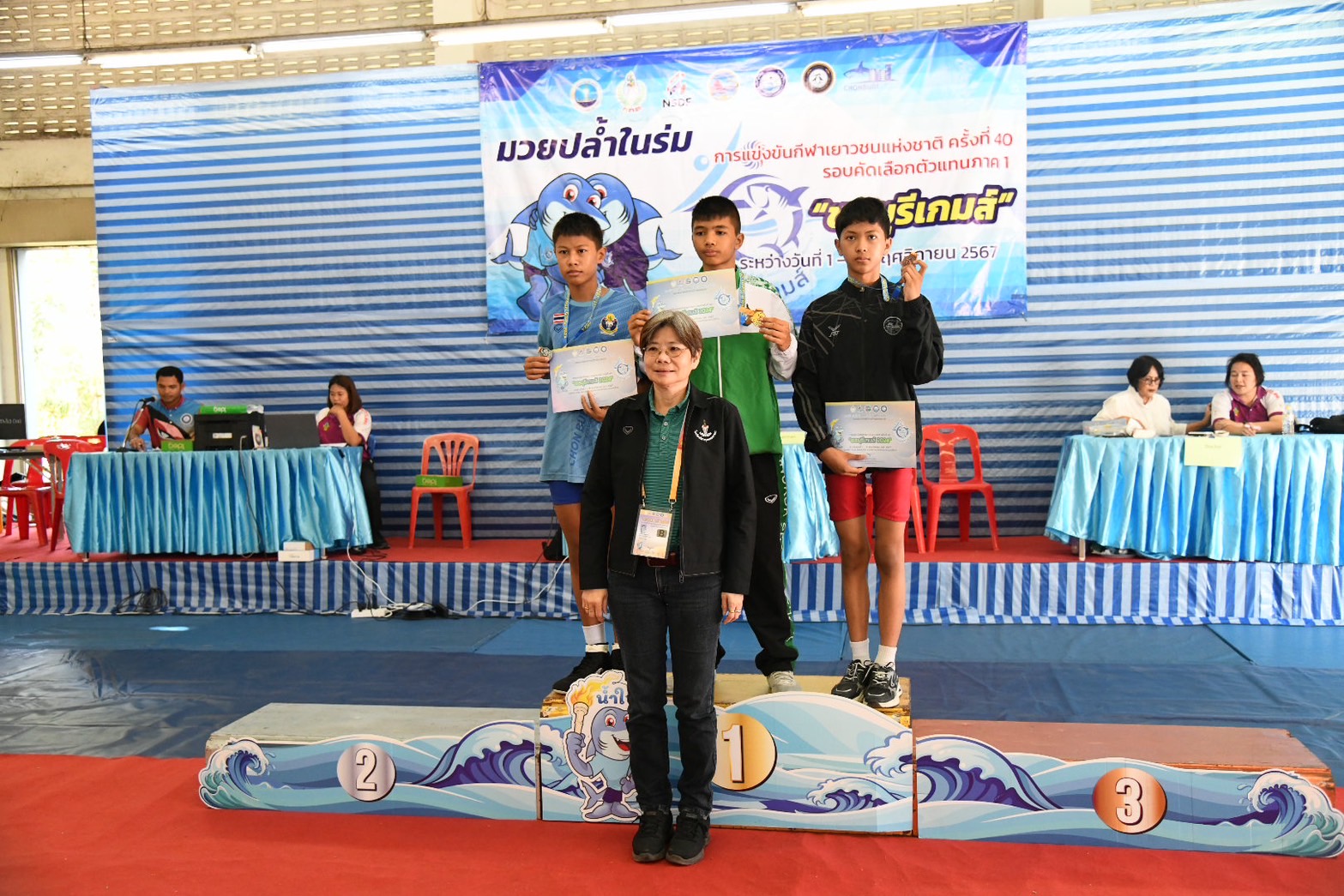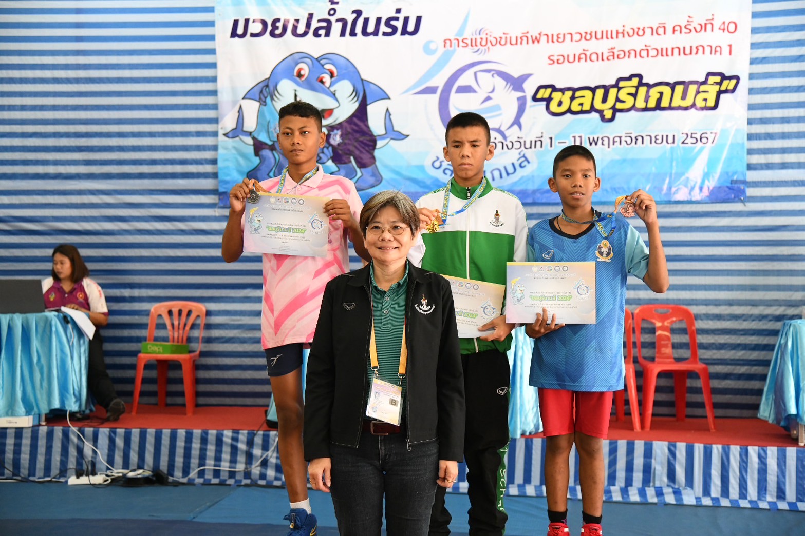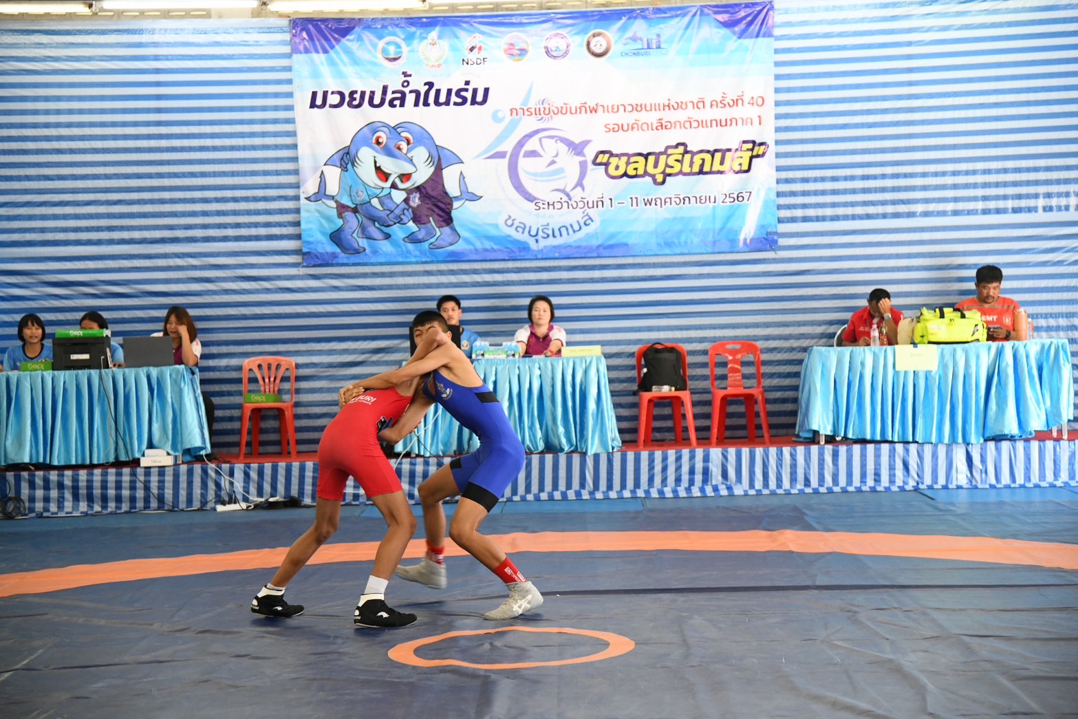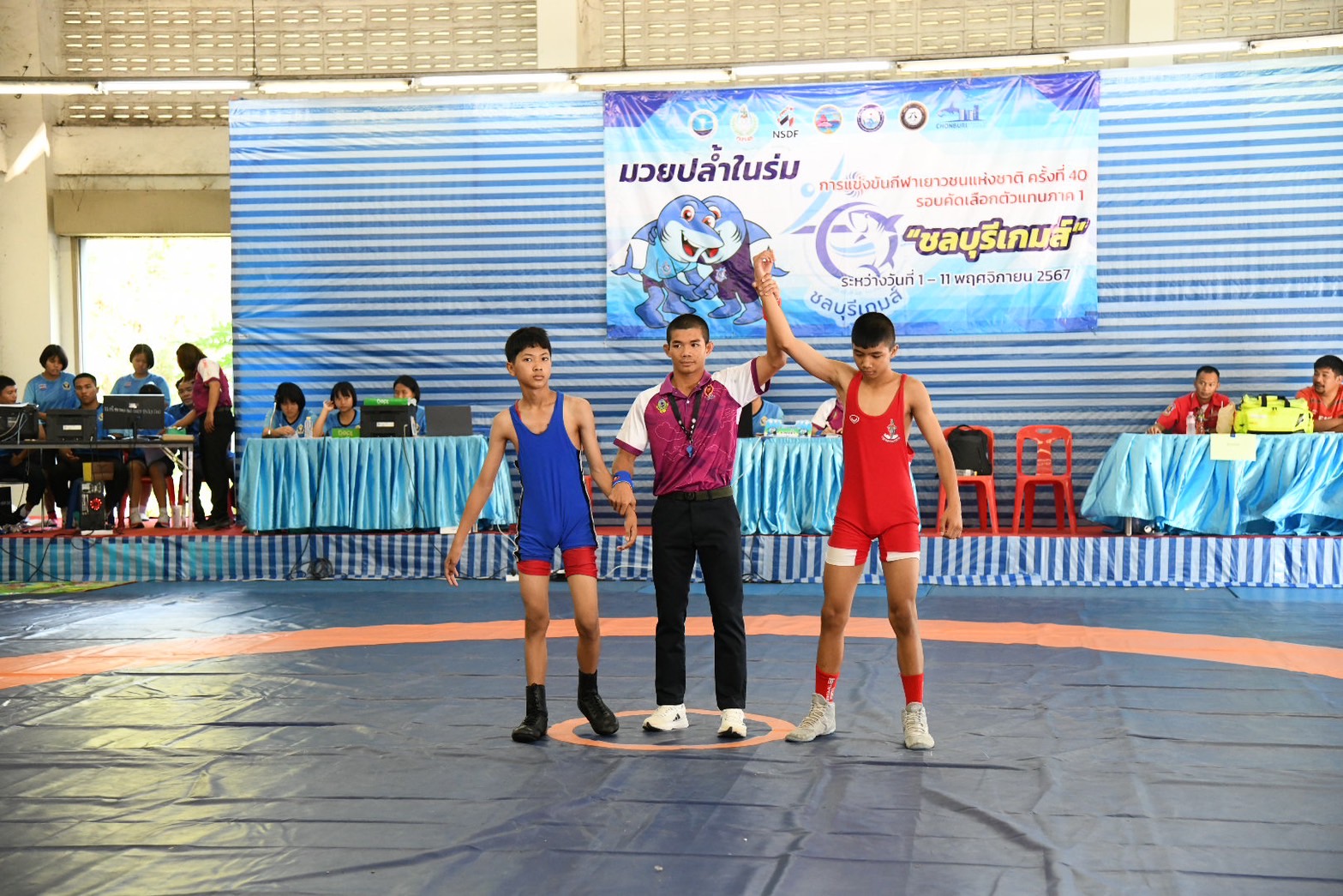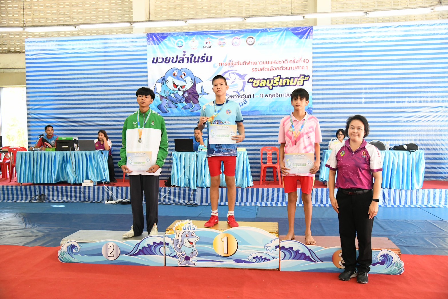 พร้อมนี้ได้ให้เกียรติมอบเหรียญรางวัลให้แก่นักกีฬามวยปล้ำในร่ม ณ โรงเรียนกีฬาจังหวัดชลบุรี